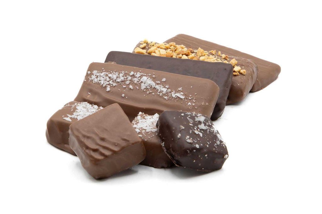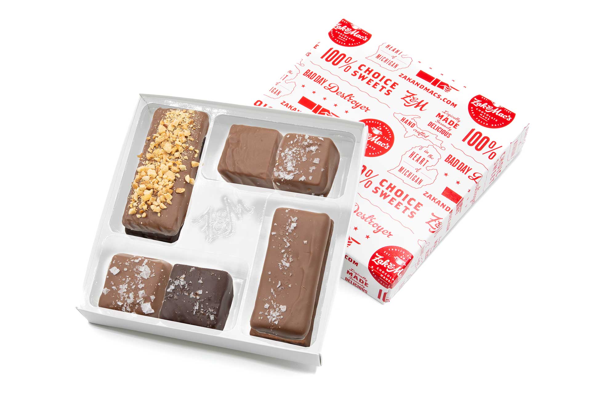 Made right here in Michigan, this box is filled with handcrafted goodness. Enjoy 4 pieces of smooth, creamy caramel covered in rich chocolate and 4 pieces of buttery, crunchy toffee — both made in small batches from our original recipes. Simple, sweet, and made with love.