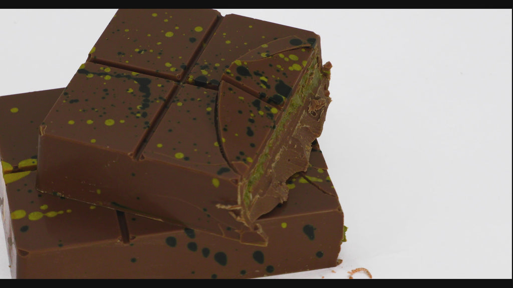 Our Dubai Bar is a luxurious blend of flavors and textures inspired by classic Middle Eastern sweets. Creamy milk chocolate surrounds a rich pistachio filling made from pistachio cream and pistachio paste, balanced with subtle notes of tahini. Crisp toasted phyllo adds a delicate crunch, creating layers that are buttery, nutty, and irresistibly smooth. A truly elegant treat for anyone who loves pistachio.